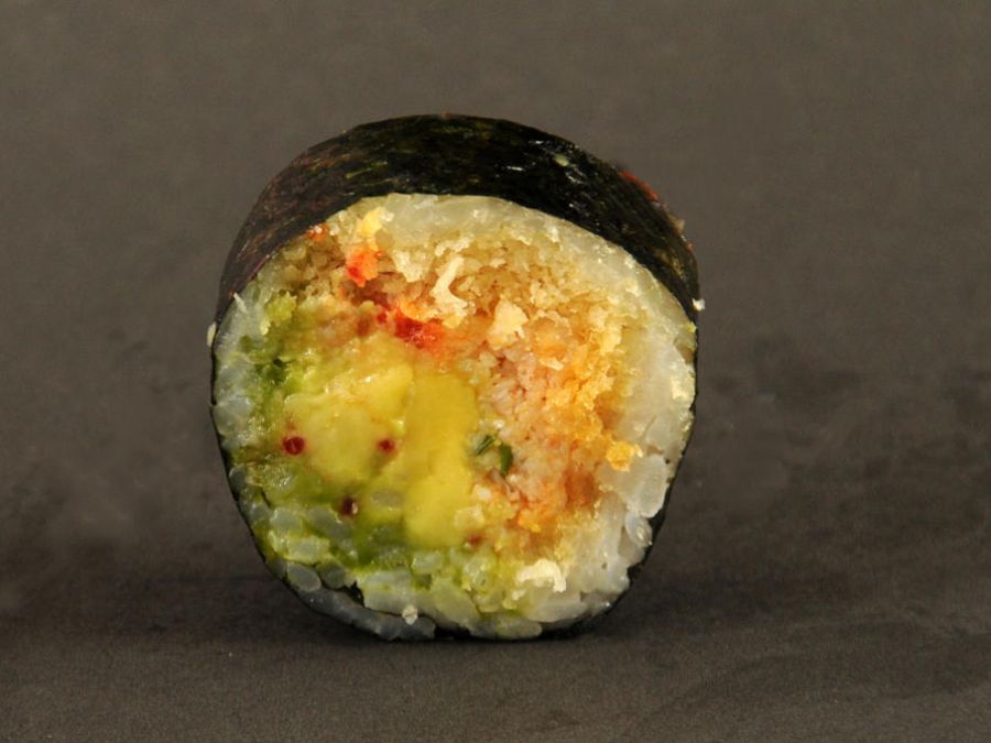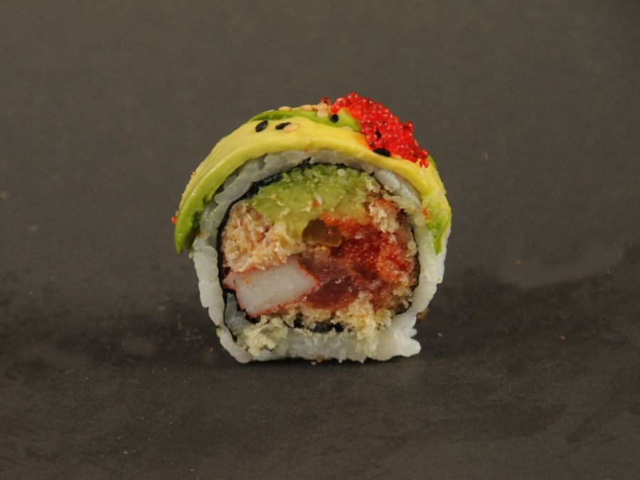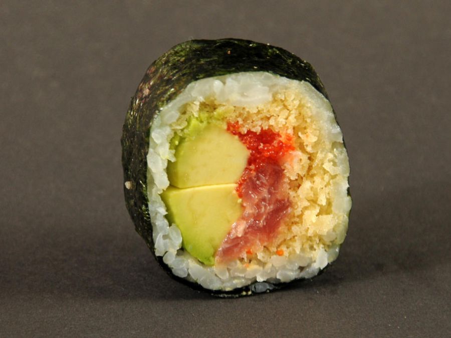 thon epice , avocat, tempura,  caviar /Spicy tuna, avocado, tempura, caviar.